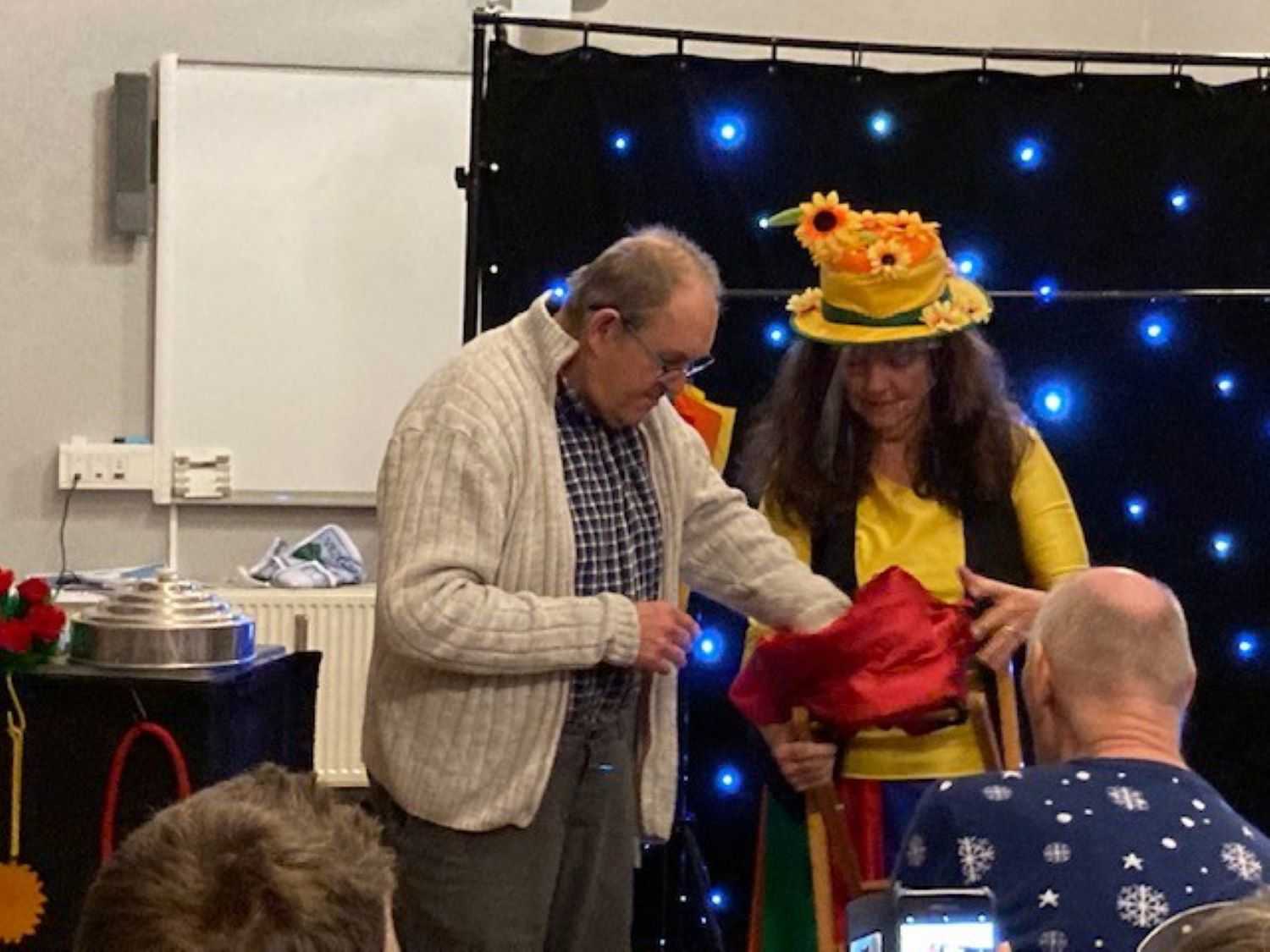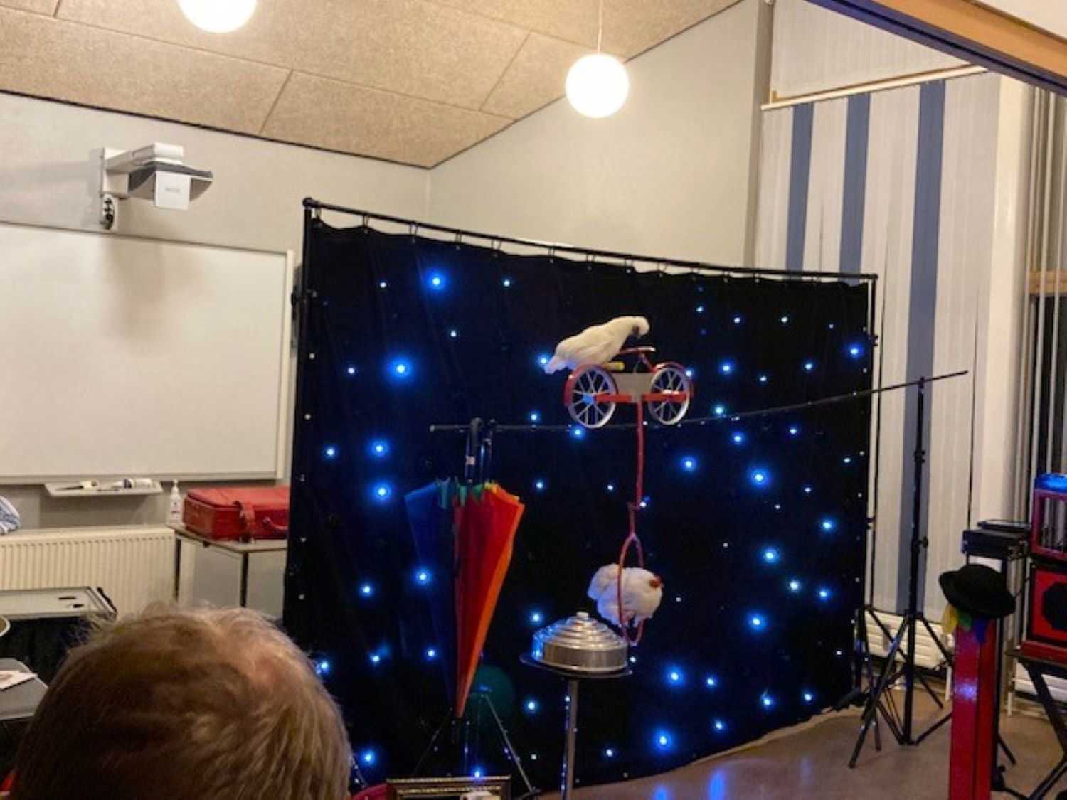 Henny tryllede for os, hun tryllede kaniner, høns og en due frem. Hun tryllede med farvede stykker stof, der pludselig blev til en farvestrålende paraply. Alle der havde lyst fik lov at hjælpe med at trylle og skulle man hjælpe Henny med et tryllenummer, var det vigtigt at have tryllehatten på og tryllestaven i hånden.